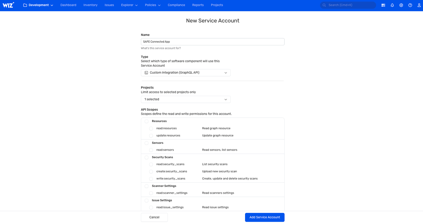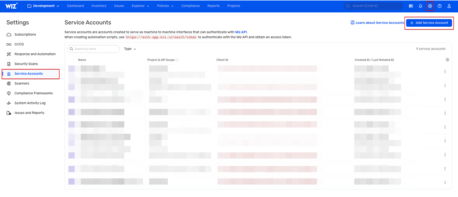 You must create a service account in Wiz to generate the Client ID and Client Secret. Follow the below steps to get the Client ID and Client Secret: