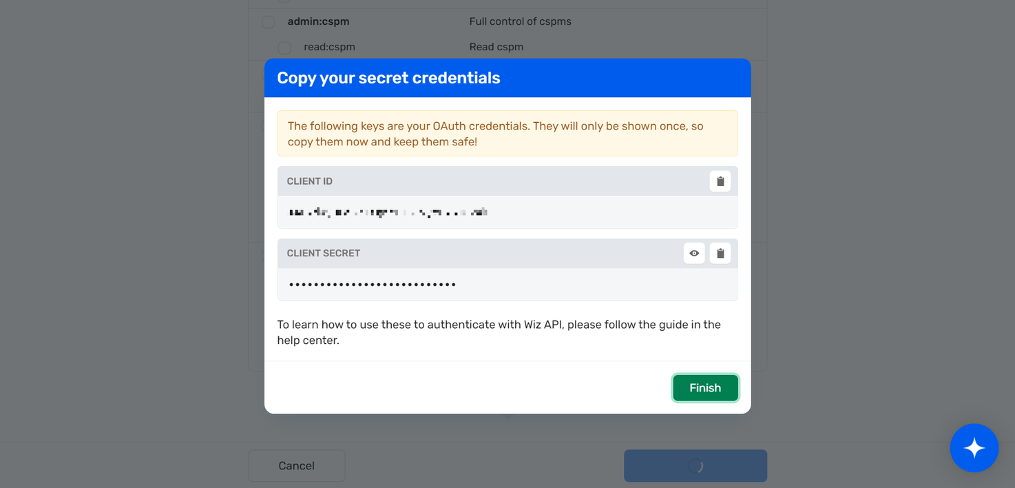 • Retrieve Credentials: Wiz will display your Client ID and Client Secret.