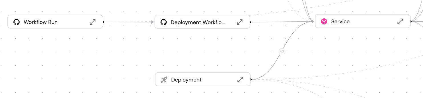 Workflow Run has a forward-relation to Deployment Workflow, which has a forward-relation to Service, which has a backward-relation to Deployment.