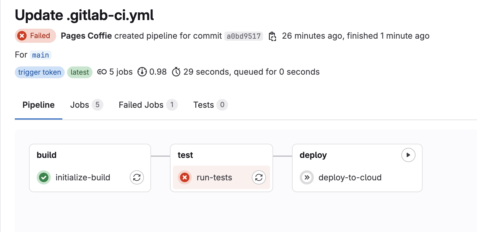 4. A GitLab pipeline will be triggered but will fail on the test stage due to not meeting coverage threshold