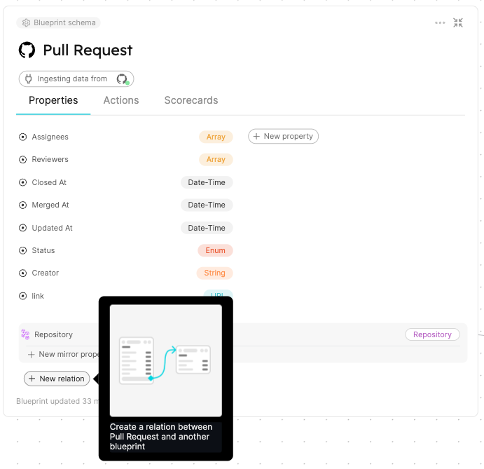 We highly recommend you install both the GitHub app and Jira integration to have pull requests and issues automatically ingested into Port in real-time. However, if you haven't installed Port's GitHub app and Jira integration, you'll need to create blueprints for GitHub pull requests and Jira issues in Port. Skip this section if you have already installed the GitHub app and Jira integration.