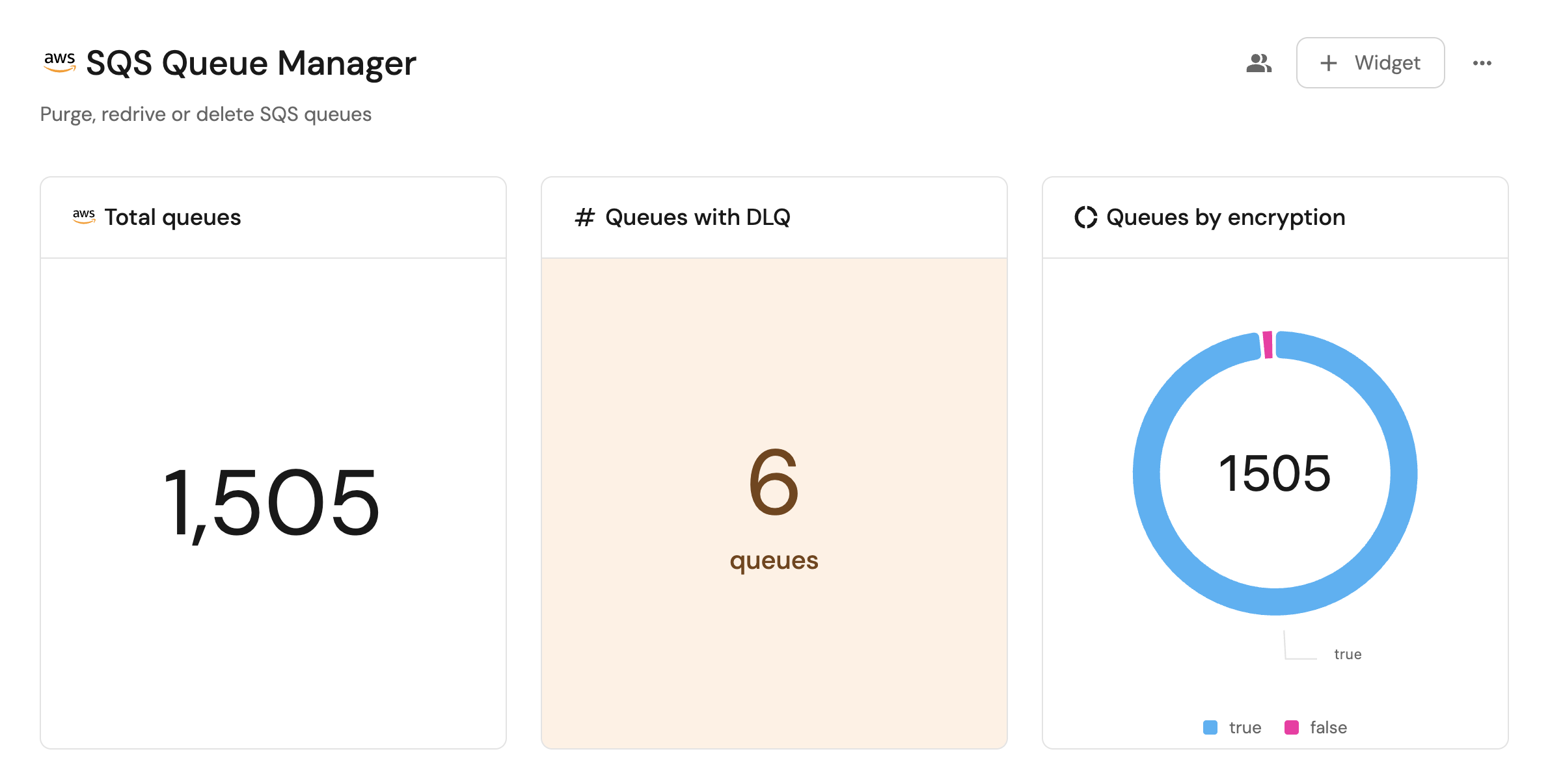 With your data and actions in place, we can create a dedicated dashboard in Port to visualize all SQS queues by type, encryption, or DLQ status using customizable widgets. In addition, we can trigger actions (purge, redrive, delete) directly from the dashboard.