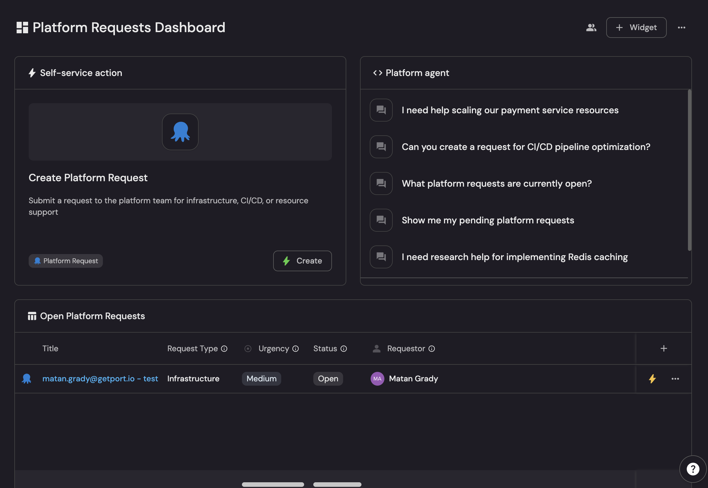 • Automated Request Fulfillment: For common and simple requests, you can enhance the AI agent by allowing it to trigger other self-service actions that fulfill the request automatically, bypassing the manual triage process. For example, if you have an action to scaffold a new service, the agent can trigger it directly for such requests.