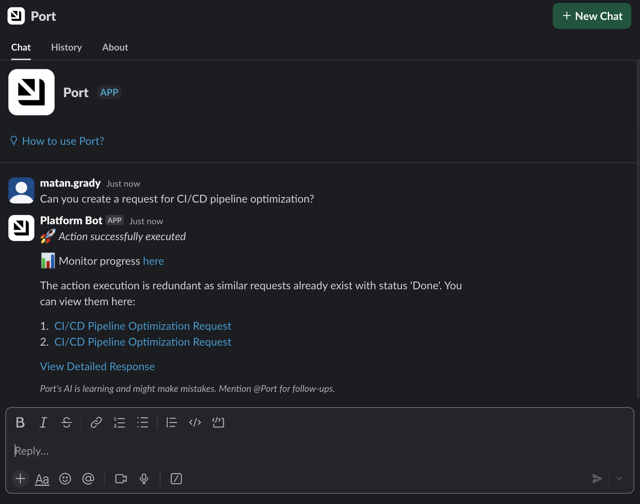 You can interact with the Platform Bot AI agent in two main ways: through the Port UI or via Slack.