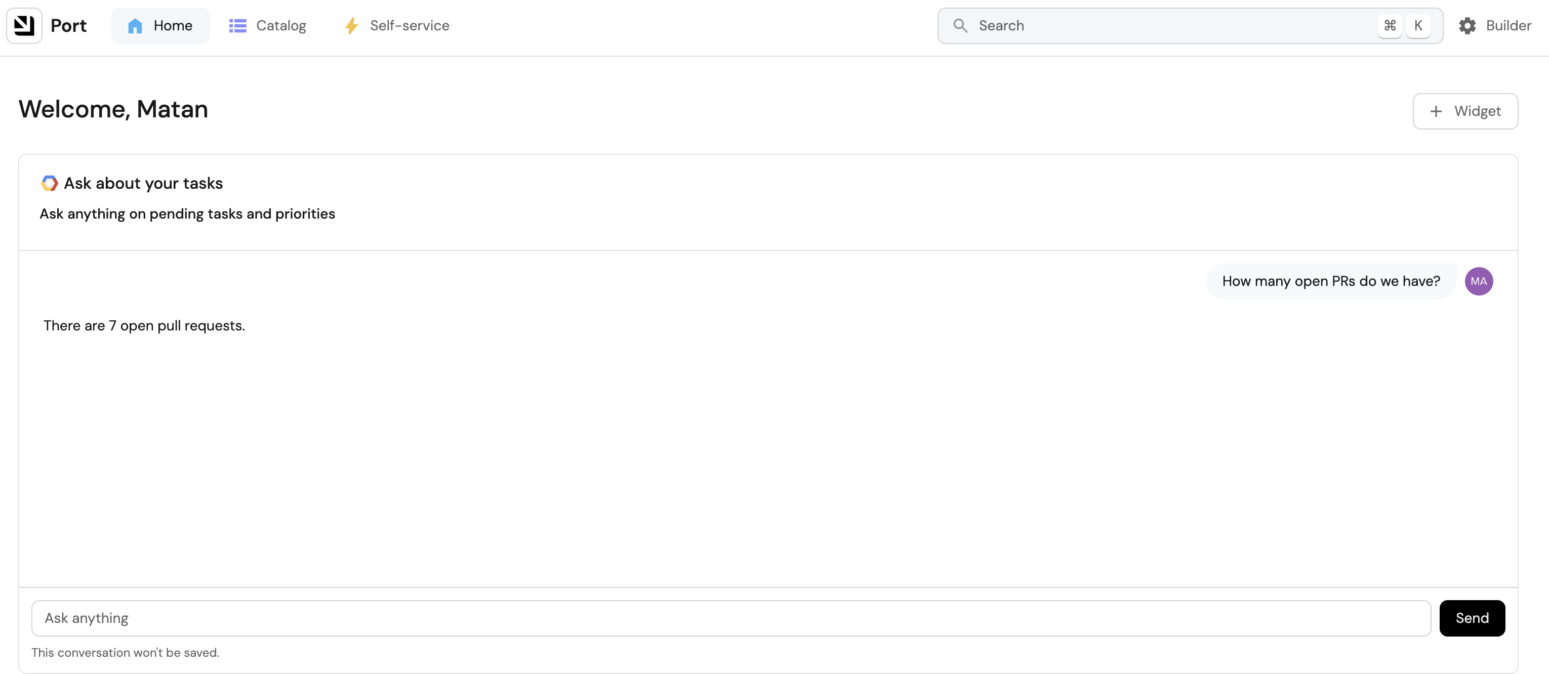The Task Manager AI agent can be accessed through an AI Agent widget in your Port dashboard.